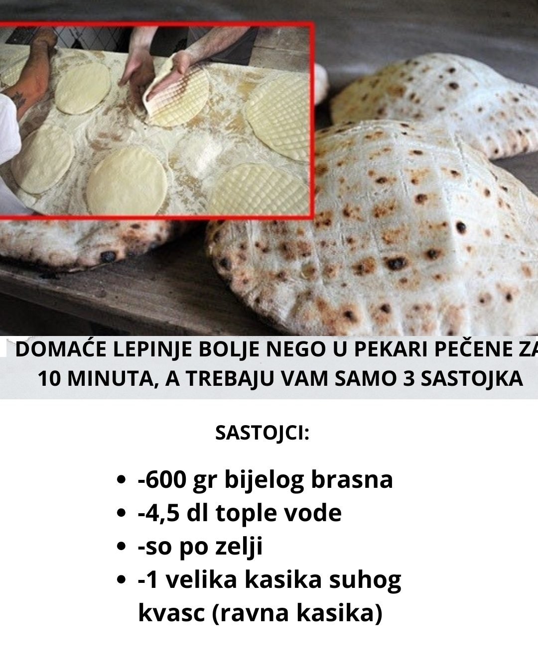 Sastojci -600 gr bijelog brasna -4,5 dl tople vode -so po zelji -1 velika kasika suhog kvasc (ravna kasika) Priprema Od ovih sastojaka zamijesiti mekano tijesto pa ga ostaviti da odmara 30 min. Kad tijesto odstoji promijesiti ga u malo brasna i sijeci otprilike jednake komade od kojih se formiraju kugle. Oklagijom razvaljati kugle u … Read more
