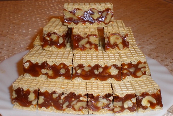 5. Smjesu izlijte na oblatnu (na onu stranu gdje su širi kvadratići) i poklopite drugom oblatnom.