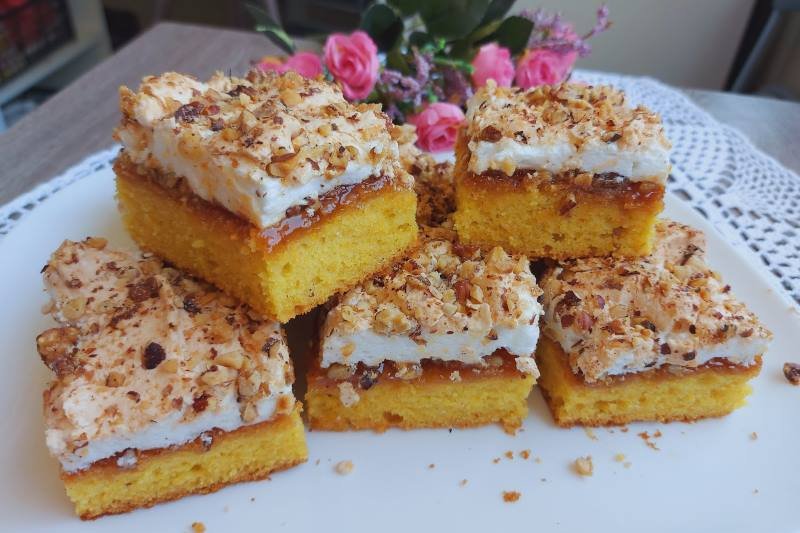 Izvaditi i premazati sa džemom i posuti sa 50 r sjeckanih oraha i lješnika. Bjelanca umutiti sa šećerom dodati 2 kašike limunovog soka. Mutiti 5-6 min. da se dobije čvrst šne.