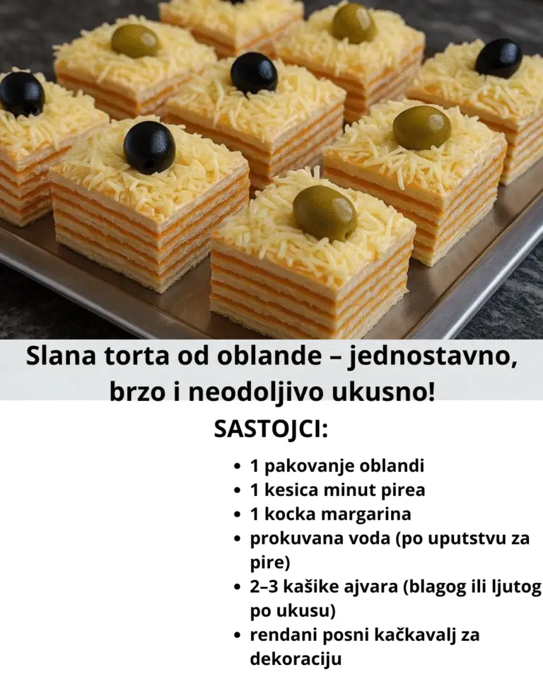 Slana torta od oblande je savršen izbor za svaku priliku — brza, dekorativna i preukusna! Ovaj recept ne zahteva mnogo truda, a rezultat je jelo koje svi obožavaju. Mekani slojevi oblande u kombinaciji sa ukusnim filom od pire krompira, margarina i ajvara čine savršenu harmoniju ukusa.